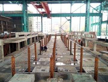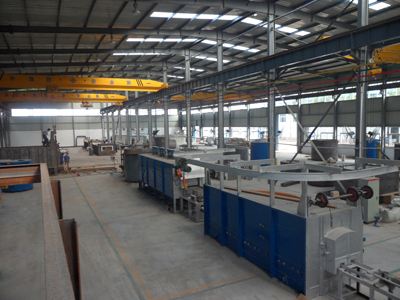 臺車式退火爐鋼 結(jié)構(gòu)主要包括爐殼支撐框架和驅(qū)動設(shè)備支撐框架(平臺鋼結(jié)構(gòu))。考慮到爐殼潛在的熱脹冷縮因素,各段爐殼支撐框架與平臺鋼結(jié)構(gòu)采川相互獨立結(jié)構(gòu)。各爐段的底 輥室先安裝就位,以自己四角立柱為基準(zhǔn)完成4個基準(zhǔn)立柱焊接;再焊接左右兩個整體端板.而操作側(cè)和傳..